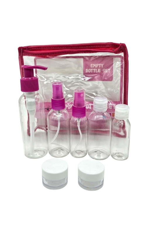 این محصول شامل ظروف پمپی ، ظروف اسپری دار ، ظروف کوچک دربدار و یک کیف نگه دارنده طلقی هست
