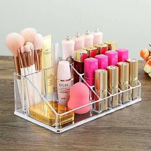 استند نظم دهنده لوازم آرایش با جنس اکرولیک شفاف که با وجود کم جا بودنش قابلیت نگهداری کلی لوازم آرایش را دارد.