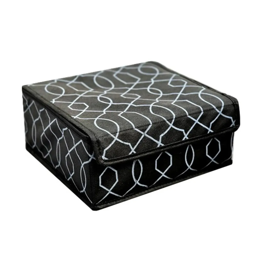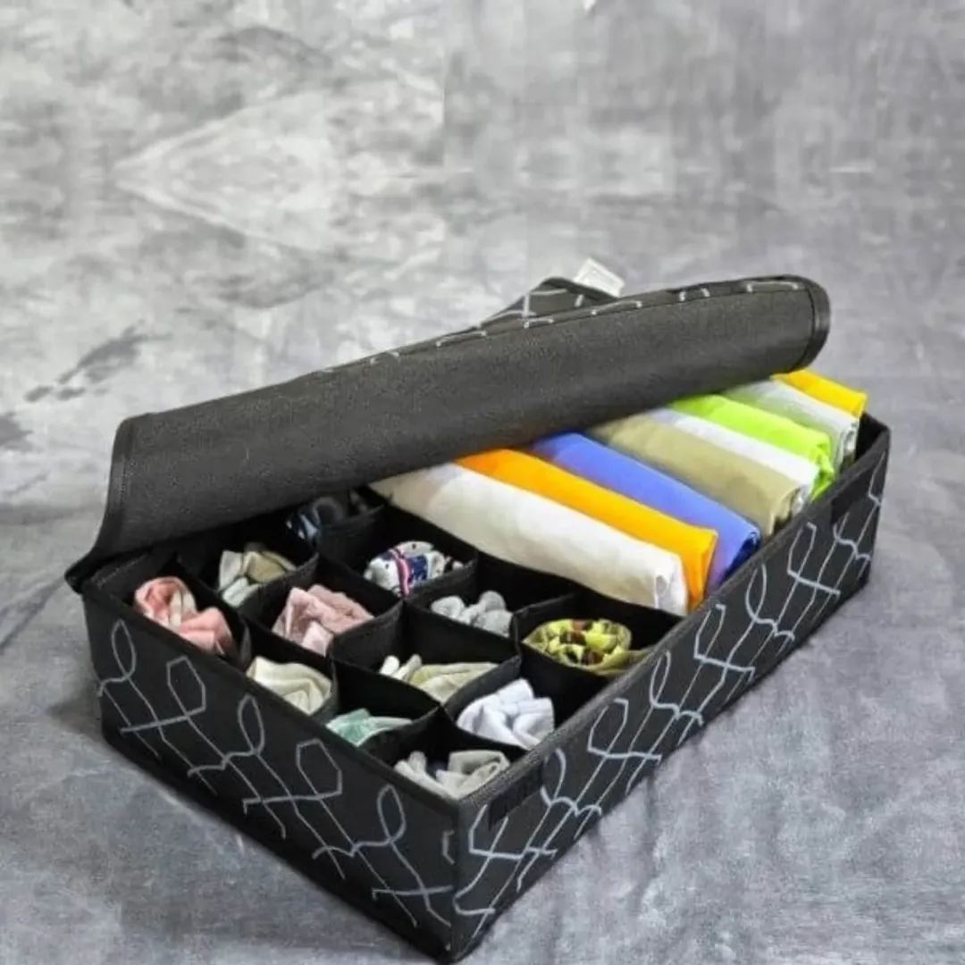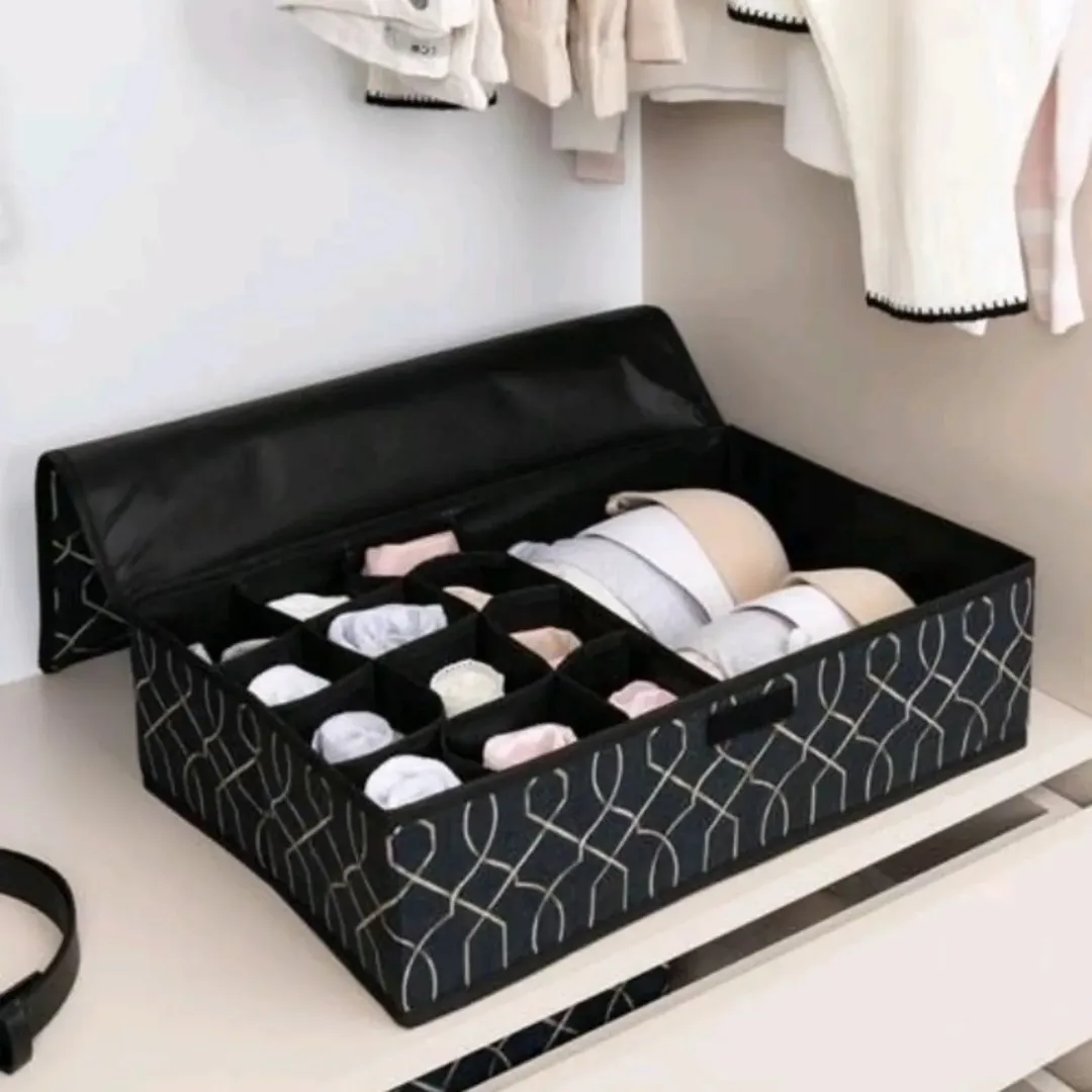 نظم دهنده دربدار دوقلو چون درب داره داخلش دیده نمیشه داخل دیواره ها مقوای ضخیم کار شده و باعث شده این محصول ایستایی خوبی داشته باشه 12خونه برای قراردادن جوراب و شورت و..داره و یک قسمت هم برای قراردادن سوتین یا رکابی مردانه. ابعاد 44 در 28 ارتفاع 12